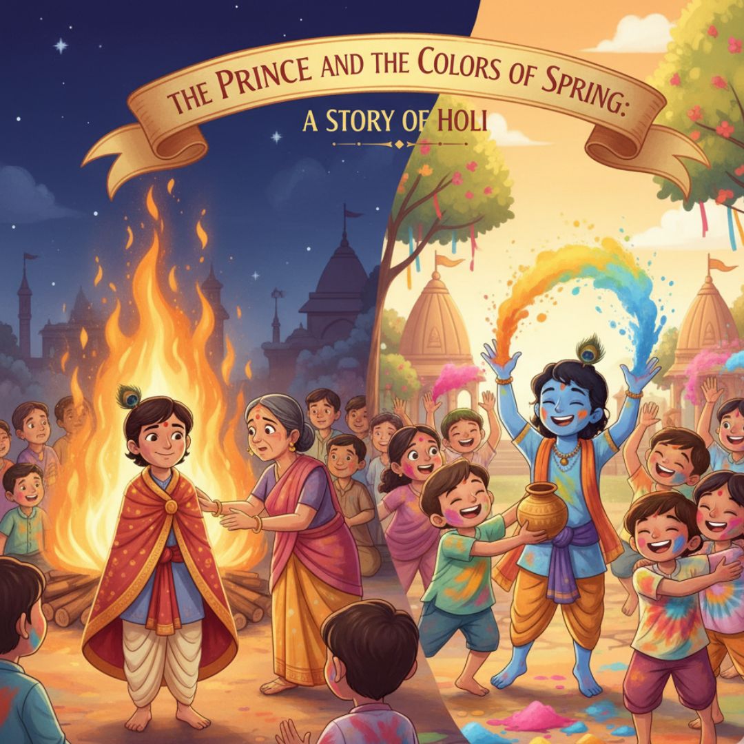 Krishna loved to play and pull pranks. He looked at his friends and noticed they all looked different. He wanted everyone to feel equal and happy together. So, he took handfuls of colorful powders—red like roses, yellow like sunshine, and green like the new grass—and playfully splashed them on his friends.